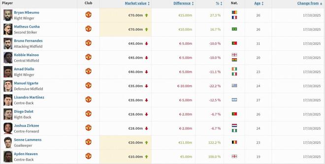 北京时间10月17日,德转市场更新了最新一期的英超球员身价。曼联队中姆伯莫身价上涨1500万欧元,拉门斯上涨1100万,库尼亚上涨1000万,乌加特身价下跌1000万欧元。