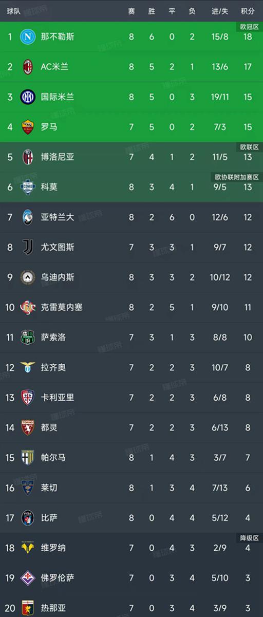 北京时间10月26日,意甲第8轮结束了5场比赛,最新积分榜如下!