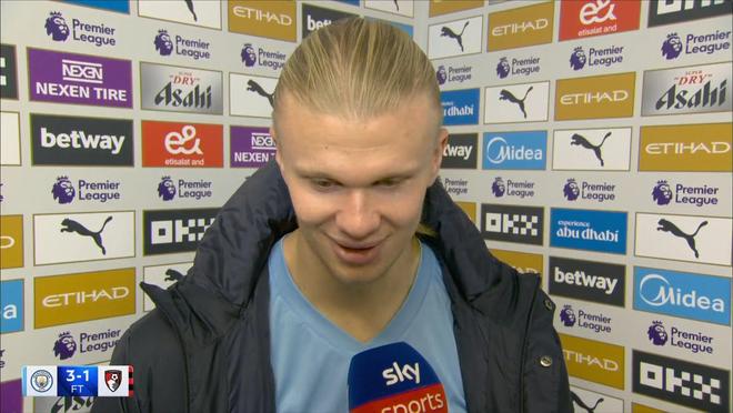 在英超第10轮上演梅开二度帮助曼城主场3-1击败伯恩茅斯之后,哈兰德接受了来自天空体育的采访。