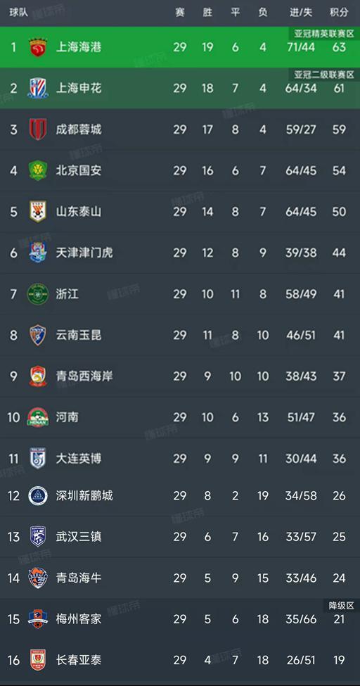 中超第29轮结束了所有比赛,最新积分榜如下!