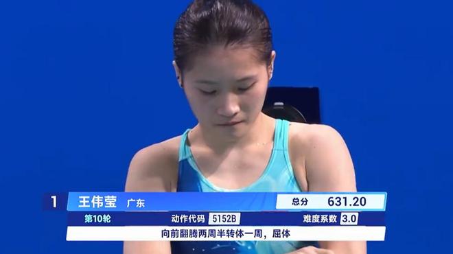 3日,广东队斩获男子团体项目金牌。4日上午的女子个人全能决赛中,王伟莹再次出战,经过5轮10米跳台、5轮3米跳板共计10轮比拼后,以700.20的总分位居第一,为广东队再添一金。