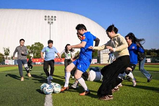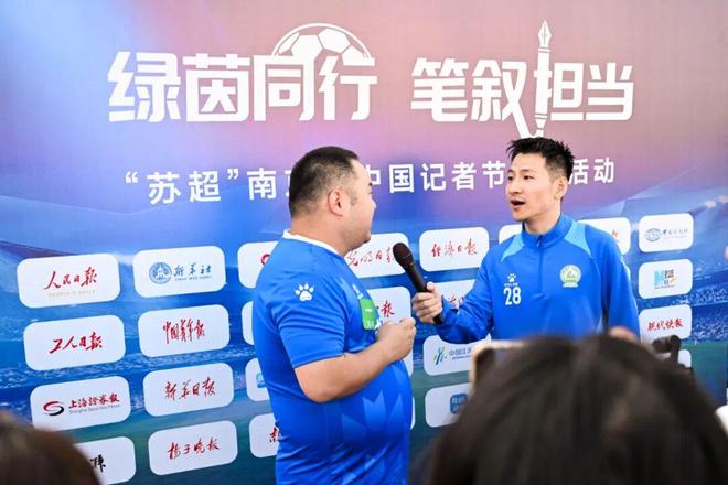 随后的趣味游戏互动环节更是欢声笑语不断。在宁央媒、省市媒体代表与苏超南京队的球员们随机组队,一起玩起了抱球绕杆接力赛,场面十分热闹。