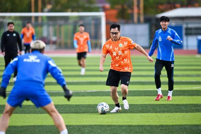 接下来的友谊赛将活动气氛推向高潮,苏超球员与媒体人混编,组成蓝橙两队同场竞技。