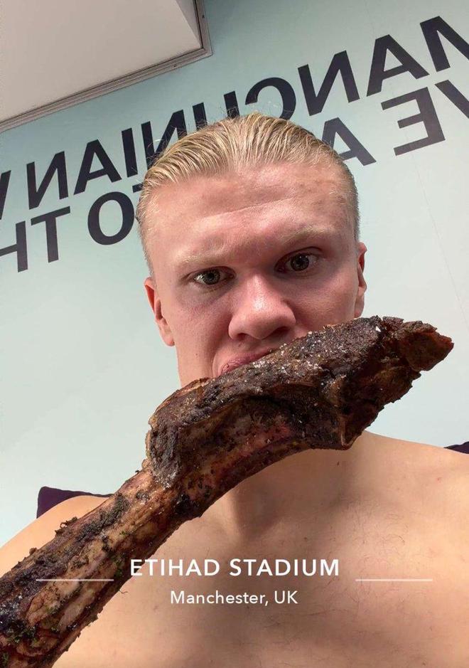 比赛结束后,哈兰德在社交媒体上晒出了自己在更衣室吃羊排的照片。