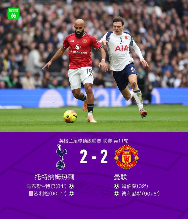 北京时间11月8日,英格兰足球超级联赛第11轮展开角逐,托特纳姆热刺坐镇主场迎战曼联。比赛中,曼联率先打破僵局,阿马德-迪亚洛送出助攻,姆伯莫完成破门,帮助球队取得领先。托特纳姆热刺在终场前发起反扑,乌多基送出精准传球,马蒂斯-特尔抓住机会扳平比分。随后在伤停补时阶段,奥多贝尔射门被里沙利松蹭进球门将比分反超。然而曼联并未放弃,读秒阶段,德利赫特头球破门,再度将比分扳平。 最终全场比赛结束,托特纳姆热刺与曼联以2比2握手言和。