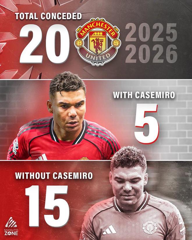 曼联在做客热刺的比赛中领先了大半场比赛,然而,当卡塞米罗在第72分钟被替换下场后,没过多久主队就扳平了比分,而且一进就是两个,险些终结了红魔的不败。数据显示,曼联本赛季的20个英超丢球中,33岁的卡塞米罗在场时只丢了5球,其余15球都是他被换下或者缺阵的比赛出现。