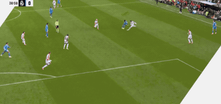 2分钟后,皇马继续猛攻,卡雷拉斯下底传中,之前在角球进攻中还没有回防的阿森西奥无人盯防头球攻门,遗憾顶偏。