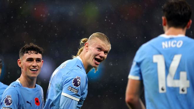 第29分钟,努内斯边路传中,科纳特头球冒顶,皮球被动砸在哈兰德的头上,顶出抛物线,顶进死角。