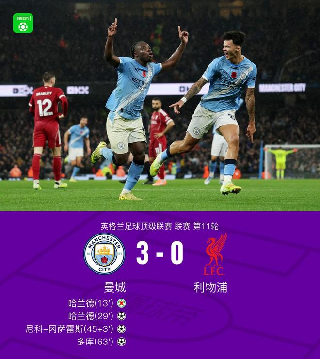 北京时间11月10日,英格兰足球超级联赛第11轮,曼城坐镇主场迎战利物浦。比赛中,哈兰德主罚点球未能命中,但随后迅速调整状态,接马特乌斯-努内斯助攻成功破门,为球队打开胜利之门。上半场补时阶段,伯纳多-席尔瓦送出精准传球,尼科-冈萨雷斯跟进得分,进一步扩大领先优势。易边再战,尼科-奥赖利送出关键助攻,多库冷静施射建功,将比分锁定为3比0。最终,曼城在主场以三球完胜利物浦,全取三分。
