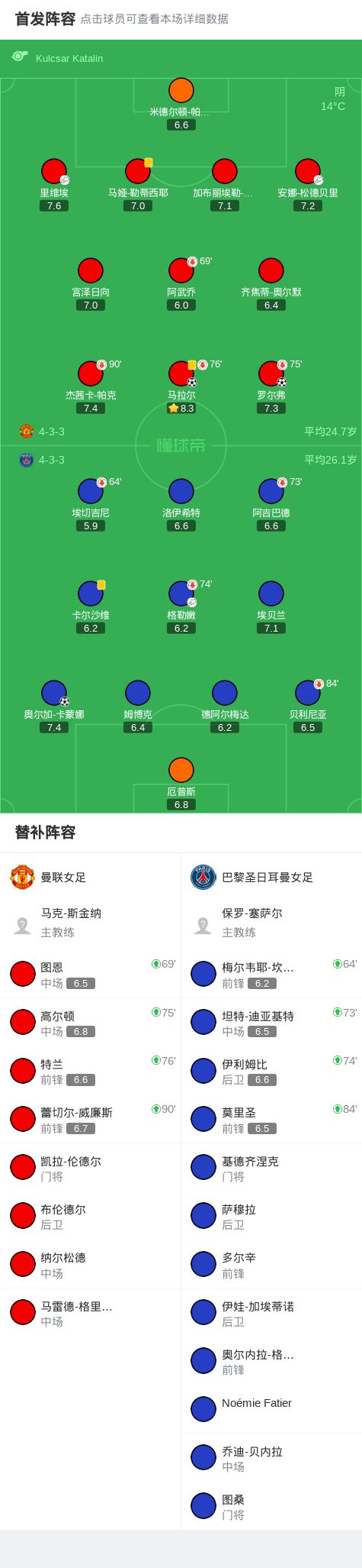 北京时间11月13日女足欧冠 联赛阶段 第3轮,曼联女足对阵巴黎圣日耳曼女足。曼联女足马拉尔破门,罗尔弗破门。巴黎圣日耳曼女足奥尔加-卡蒙娜破门。最终比分曼联女足 2-1 巴黎圣日耳曼女足。曼联女足取得女足欧冠的三连胜,同时送给巴黎女足3连败。