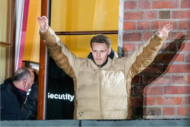 在挪威队4-1击败意大利队的比赛结束第二天,当地时间周一晚上,挪威队的球员们齐聚挪威市政厅。