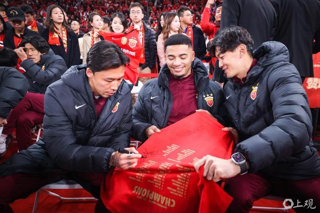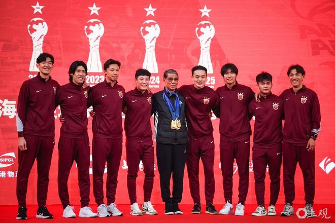 徐根宝指导亲临现场,武磊、颜骏凌、吕文君、王燊超、刘若钒、张琳芃、蒯纪闻、李新翔几位出自崇明基地的海港球员,将冠军奖牌佩戴在徐根宝的胸前,表达他们对恩师的感谢,场面温馨感人。