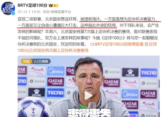 在这期《足球100分》的节目预告(下图)中,该京媒直面问题本身,在官微上写道:“亚冠二级联赛,北京国安葬送好局,被提前淘汰。一方面是想为足协杯决赛留力,一方面却又让自信心遭遇巨大打击,......。”