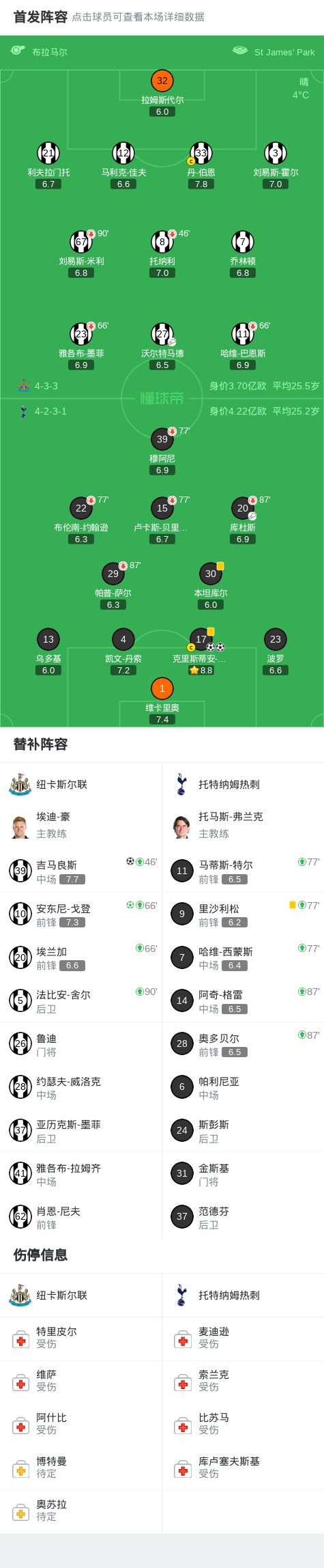 北京时间12月3日英格兰足球顶级联赛 联赛 第14轮,纽卡斯尔联主场对阵托特纳姆热刺。纽卡斯尔联吉马良斯破门,安东尼-戈登破门。托特纳姆热刺克里斯蒂安-罗梅罗梅开二度。最终比分纽卡斯尔联 2-2 热刺。