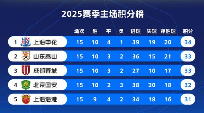 北京时间12月2日,中超官方统计出了2025赛季主场积分排名前五的球队,上海申花以10胜4平1负积34分的主场成绩排名第一,最终夺冠的上海海港15个主场比赛拿到31分仅排名第五。