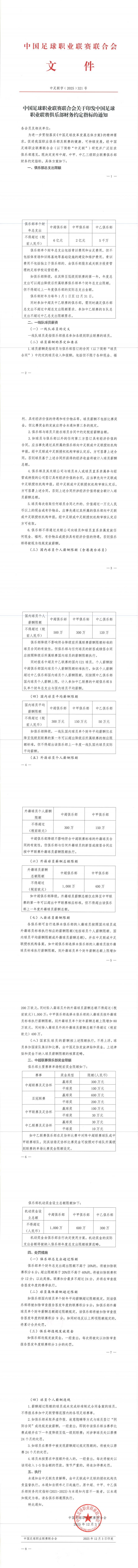 外籍球员个人薪酬限额分别不得超过300万欧元(中超俱乐部)和150万欧元(中甲俱乐部)。