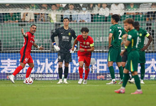 ↑9月21日,上海海港队球员莱昂纳多(左一)在比赛中庆祝进球。中超第25轮,北京国安队主场2:3不敌上海海港队。新华社记者 胡星宇 摄