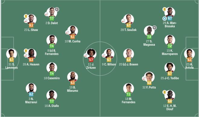 曼联(3421):31-拉门斯;3-马兹拉维,26-海文(46’15-约罗),23-卢克肖(88’6-利马);16-迪亚洛,18-卡塞米罗,8-B费,20-达洛特(68’13-多古);19-姆伯莫,10-库尼亚(77’25-乌加特;11-齐尔克泽(78’7-芒特)