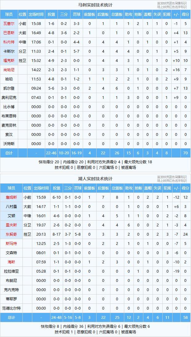 湖人(主队):东契奇24分3板2助、詹姆斯12分8板1助2帽、艾顿8分5板1助、斯玛特5分2板1助、里夫斯4分4板6助、八村塁3分1助、海斯2分3板