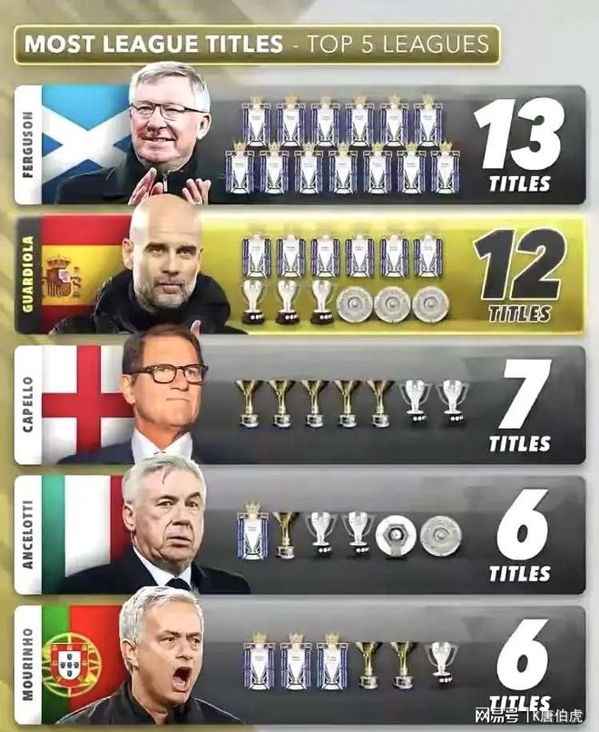 穆里尼奥也同样拥有6个冠军奖杯,包含了3个英超、2个意甲以及1个西甲冠军。而今来看他的五大联赛冠军数不会再增加了,因为他早就不受主流联赛的欢迎。其张狂的为人处事方式让他无法再有机会执教任何一支五大联赛的球队,尤其是豪门也几乎等同于对他彻底关闭。
