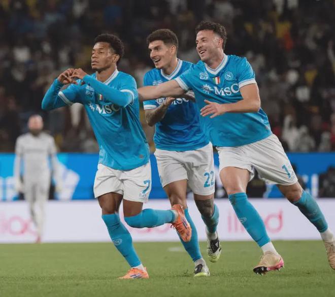 沙特国王大学体育场的夜晚,灯光像撒了一把碎金,落在内雷斯的球鞋上。第39分钟,他右肋持球的瞬间,整个球场都静了——虚晃、内切、起脚,皮球划出一道带着复仇火焰的弧线,绕过博洛尼亚门将拉瓦利亚的指尖,“砰”地砸进远角。看台上的那不勒斯球迷跳起来,喊声震得体育场的顶棚发颤:这不是一个普通的进球,是他们等了43天的“算账”,是孔蒂带来的“复兴宣言”。