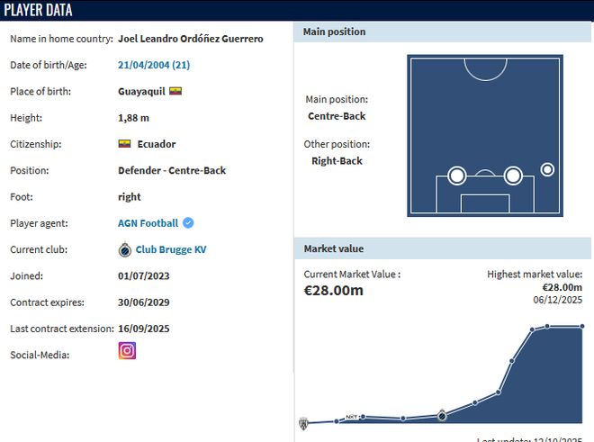奥多涅斯毫无意义算得上厄瓜多尔山谷独立队这几年里出产的黄金一代之一了,21岁在欧洲比甲豪门布鲁日和欧冠有超过百场的比赛记录,未来登入豪门可能性非常高(目前除了利物浦,最关注他的莫过于后防更新换代的国米)。今年夏季窗口布鲁日对于厄瓜多尔国脚要价在30m欧左右,冬季窗口也一样愿意放人离队,价格因为表现上涨,但也只有35-40m欧。我会说他肯定是爱德华兹喜欢的人,天赋明显也是比较培养价值的,1月份会不会有转会,可以拭目以待。
