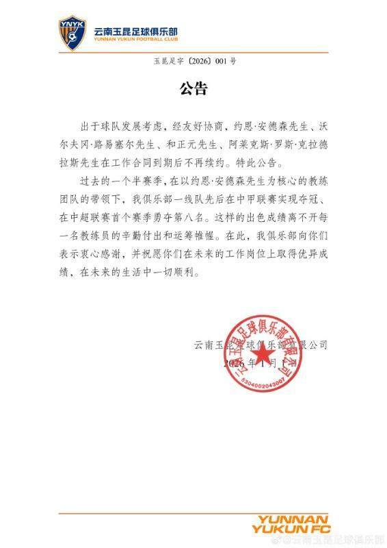 出于球队发展考虑,经友好协商,约恩·安德森先生、沃尔夫冈·路易塞尔先生、和正元先生、阿莱克斯·罗斯·克拉德拉斯先生在工作合同到期后不再续约。特此公告。