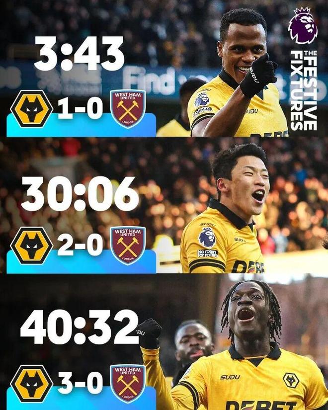本赛季,英超最大的悬念并非谁能夺冠,而是排名垫底的狼队何时才能拿到赛季首胜。而在第20轮比赛中,这一悬念终于迎来了答案。狼队坐镇主场半场便3-0领先西汉姆联,阿里亚斯首开纪录,韩国前锋黄喜灿传射建功,马特乌斯·马内造点+破门,最终成功拿到了赛季首胜。而作为对手的西汉姆联,他们在前狼队主帅努诺的带领下已经连续9轮比赛不胜,深陷英超保级区。