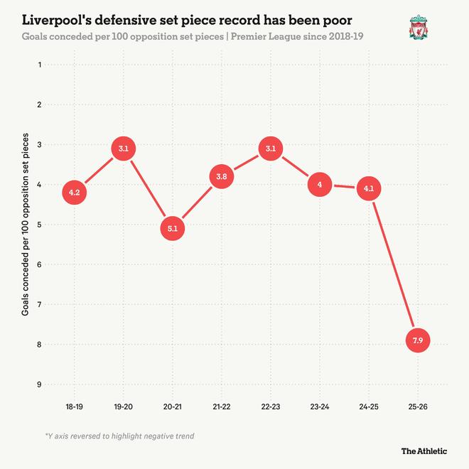 利物浦在自己的禁区内表现更差,如果考虑到防守机会,他们目前每100次定位球防守丢球7.9个,几乎是上赛季的两倍,如果将时间跨度拉长到过去七个赛季,他们防守纪录的下滑就更加明显了。