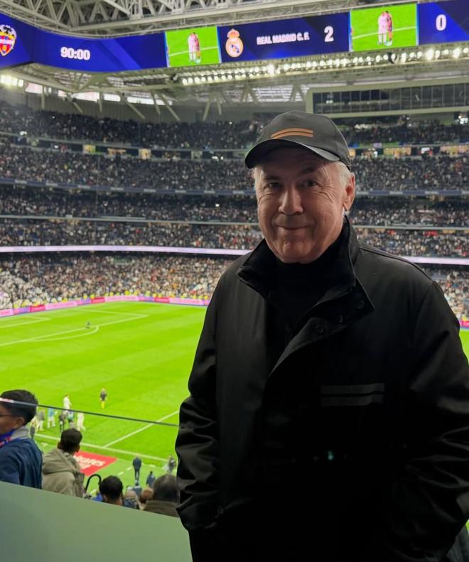 本轮西甲,皇马主场以2-0击败莱万特。今日,前皇马主帅安切洛蒂在社交媒体上晒出了自己重返伯纳乌的照片,并配文写道:“看到皇马取胜真的非常开心!和我在巴西国家队的同僚一起分享这份胜利。”