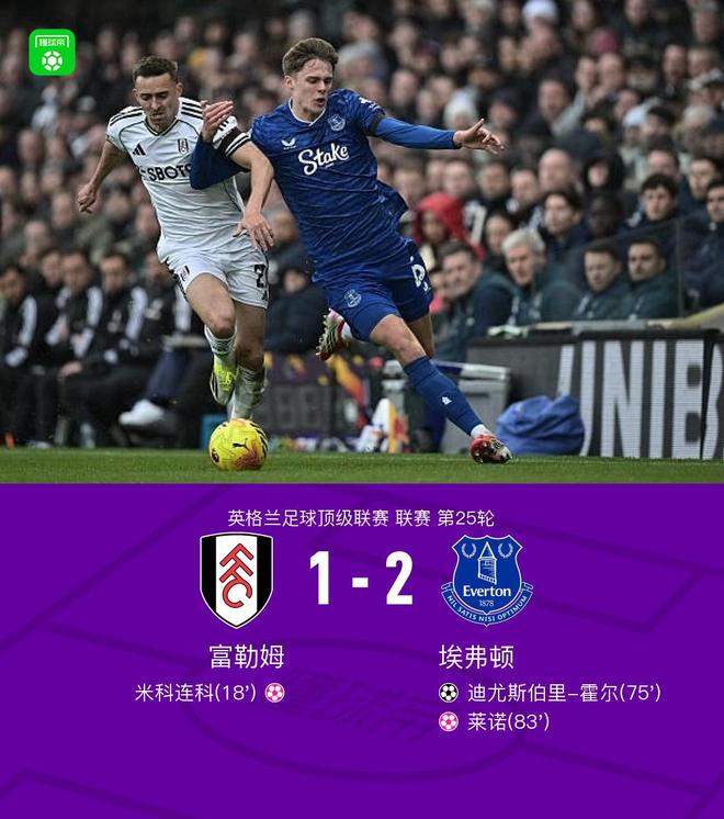 北京时间2月7日英格兰足球顶级联赛 联赛 第25轮,富勒姆主场对阵埃弗顿。富勒姆莱诺自摆乌龙。上半场埃弗顿迪尤斯伯里-霍尔破门,下半场米科连科自摆乌龙,门将莱诺自摆乌龙。最终比分富勒姆 1-2 埃弗顿。