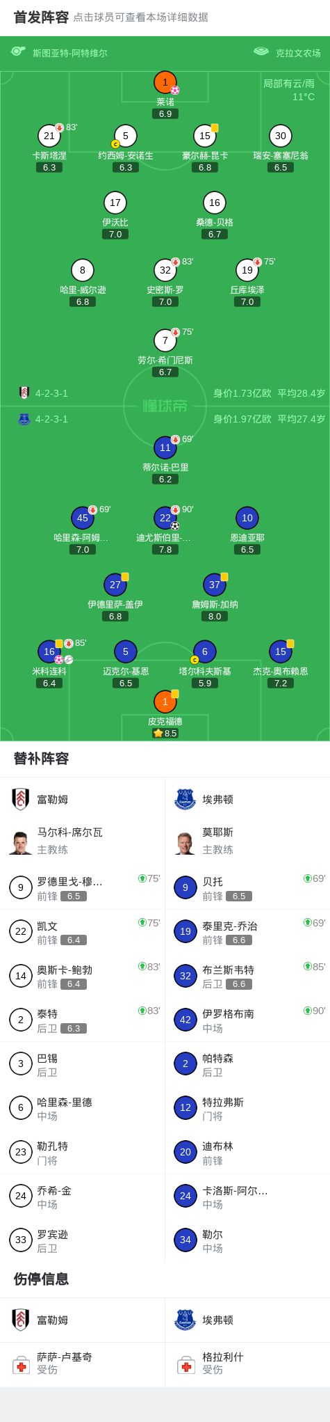 第17分钟,希门尼斯射门,米科连科自摆乌龙,富勒姆1-0埃弗顿