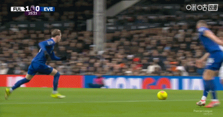 第75分钟,霍尔中路抢点,低射扳平比分,富勒姆1-1埃弗顿