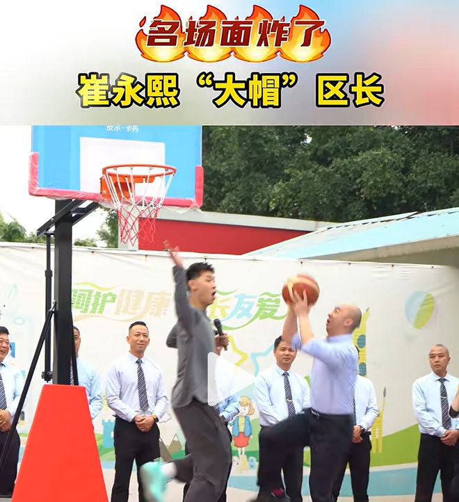 不过,笑归笑,闹归闹!在给区长送出“大帽”之后,崔永熙似乎也是感到了有一些不太对,于是,接下来,就直接“放水”,让区长有了一个空篮的机会,我们可以看到,这位区长也是技术了得,在无人的防守下,轻松将篮球打进……于是,大家也是开心地送出了点赞的掌声!