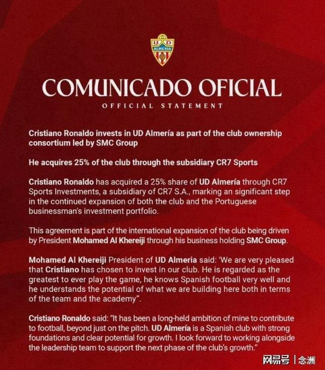 C罗发布声明称:“长期以来,我一直有志于在球场之外为足球做出贡献。阿尔梅里亚是一家拥有坚实基础和明显成长潜力的西班牙俱乐部。我希望能与管理团队合作,支持俱乐部进入新的成长阶段。”