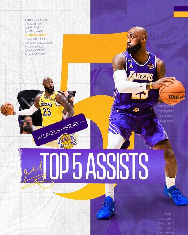 此役,詹姆斯还创下了纪录。送出本场第3次助攻之时,詹姆斯湖人生涯的助攻次数来到了3667次,超越了迈克尔·库珀的3666次,升至湖人队史助攻榜第五位。