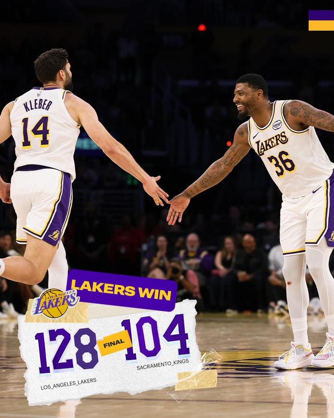 克利福德高位跳投得手,拉拉维亚暴扣,萨克拉门托请求暂停。距离终场还剩6分20秒,湖人换下全部首发,国王派上了大部分替补球员,两队开始在场上练兵,比赛逐渐失去了悬念。最终,紫金军团以128比104完胜国王,得以斩获2连胜。
