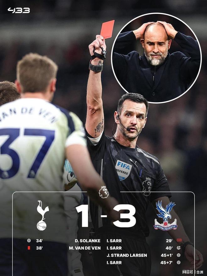 英超第29轮,热刺主场1-3负于水晶宫,5连败+11轮不胜,积29分仅领先降级区1分。萨尔进球被吹,索兰克建功,范德芬送红点,萨尔点射命中+双响,拉尔森破门,丹索头球攻门、索兰克小角度射门被扑。