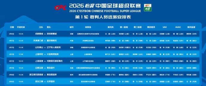 闪电体育3月6报道中足联公布了中超联赛首轮裁判执法名单,山东泰山主场对阵辽宁铁人的主裁判为张雷。