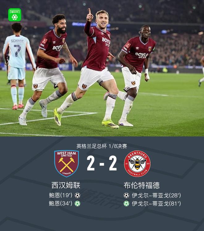 北京时间3月10日英格兰足总杯 1/8决赛,西汉姆联对阵布伦特福德。上半场,鲍恩双响。科林斯头槌击中蒂亚戈得分。下半场,卡约德造点,蒂亚戈主罚命中。90分钟战罢,两队2-2战平进入加时赛。