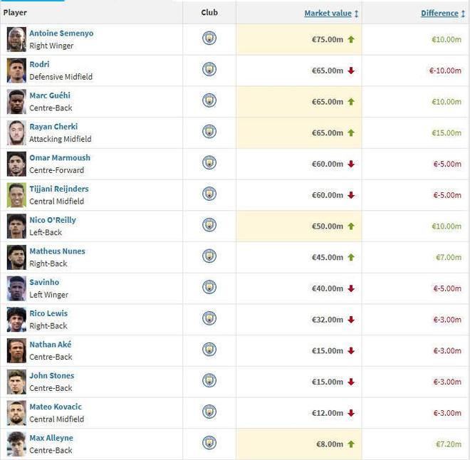 北京时间3月9日,德国转会市场公布了英超球员的最新身价,曼城方面共有14名球员身价有变化,其中有6名球员身价上涨,8名球员身价下跌。
