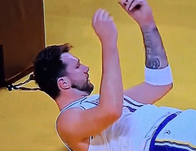 事件发生在周一湖人战胜纽约尼克斯的比赛第三节。当时东契奇被尼克斯后卫沙梅特抢断,随后在快攻中试图造迪亚瓦拉进攻犯规,却被吹罚阻挡犯规。他躺在地上时,盯着裁判做出了手指搓动的“数钱手势”。