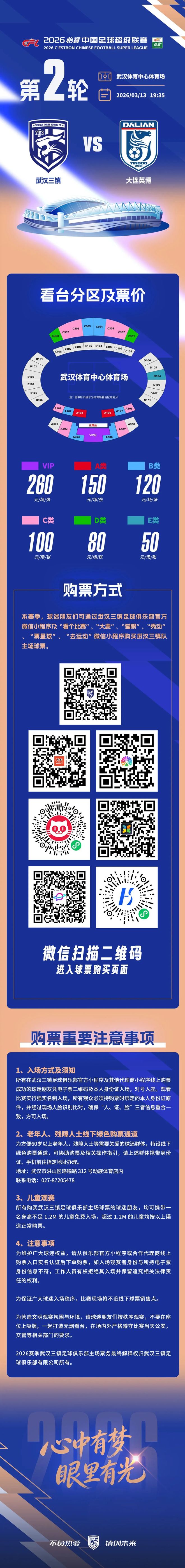 3月13日,武汉三镇将在2026中超第2轮中继续坐镇主场,迎战大连英博。本场比赛球票现已开启发售!欢迎各位球迷朋友进行购买,一起为武汉三镇加油助威!