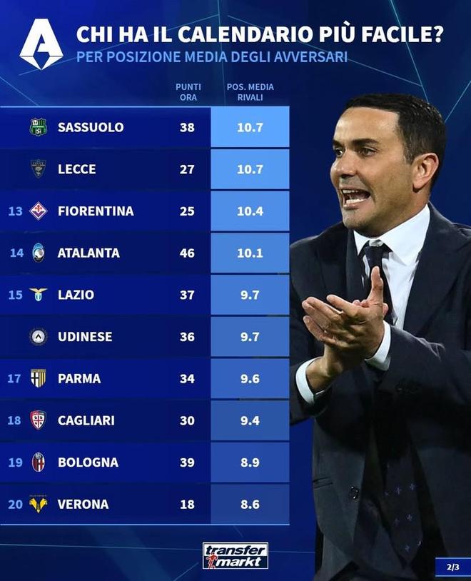 北京时间3月11日,德转统计出了本赛季意甲剩余10轮各支球队将会遭遇的对手在联赛中的平均排名,其中尤文图斯的最后10个对手目前平均排名第11.7位,为所有球队最低。目前7分优势领跑积分榜的国际米兰最后10轮对手的平均排名则为11.1位。