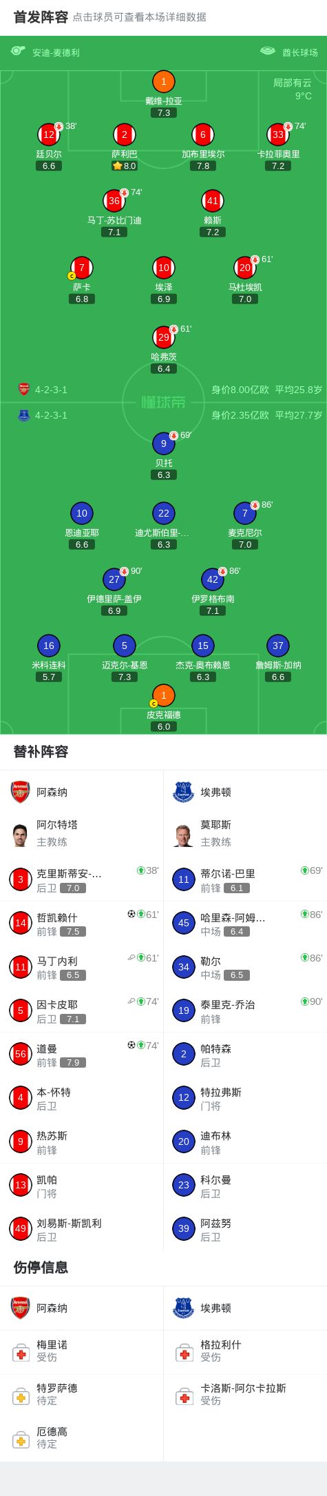 第61分钟,阿森纳连换两人,马丁内利、哲凯赖什替补登场