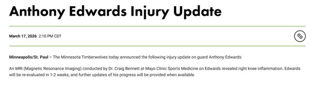 北京时间3月18日,森林狼队官方宣布,安东尼-爱德华兹因右膝酸痛今日将缺战太阳。他接受了核磁共振检查,结果显示其右膝存在炎症。据森林狼方面透露,爱德华兹将在1~2周后接受复查,后续情况将在有更新时对外公布。