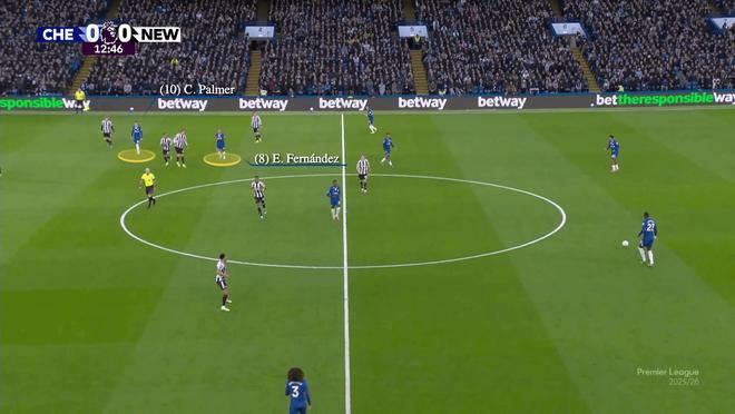 波切蒂诺最终看到了让费尔南德斯位置更靠前、身后有更多防守掩护的价值。马雷斯卡在他更有层次的体系中发展了这一用法,有效地将这位前本菲卡人变成了他盒式中场的左侧“十号位”。这个角色将帕尔默从球队主要组织者移到了右侧十号位。有时,这个安排会为了适应库库雷利亚或古斯托从边后卫内收进攻中场而调整,但总体角色分工保持一致。