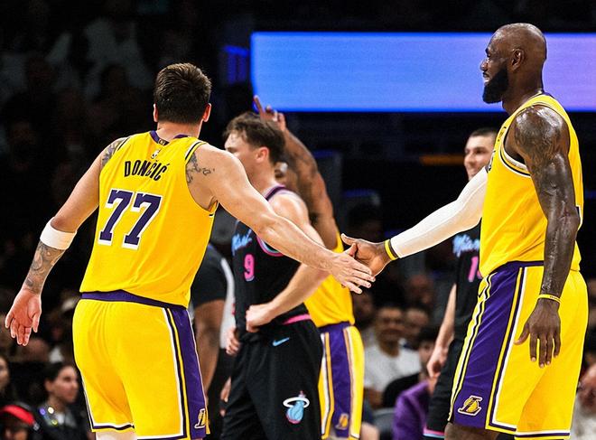 热火队坐镇主场,以逸待劳,开局就轰出9-0抢占先机,给了湖人一个下马威。东契奇挺身而出为湖人队止血,可热火队气势如虹单节轰下42分,早早取得两位数领先。第二节,老詹对飙鲍威尔,湖人队抓住热火队手感变凉的机会疯狂追分,热火队半场结束时仅领先6分。易边再战,湖人队愈战愈勇,东契奇单节砍下19分,湖人队单节净胜15分,一举将比分反超。末节决战,两队陷入对轰战,比分咬得很紧,比赛悬念拖到关键时刻,东契奇连砍16分杀死比赛。最终,湖人队以134-126险胜热火队。