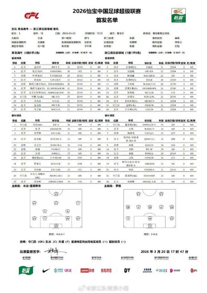 北京时间3月20日19点35分,中超第3轮青岛海牛坐镇主场迎战浙江,本场主裁判王迪,VAR裁判沈寅豪。双方赛前公布首发名单。