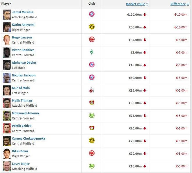 1、穆西亚拉(拜仁) 下跌1000万欧至1.3亿欧